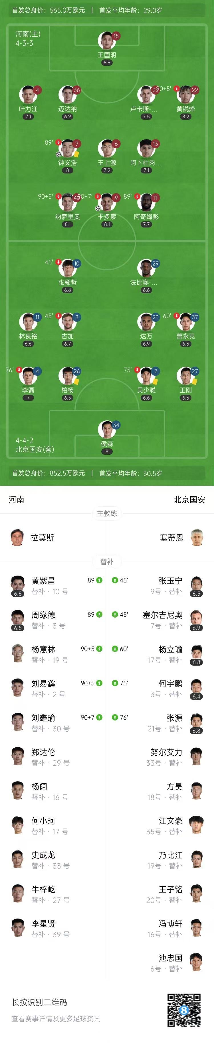 全场比赛结束,河南2-0北京国安。