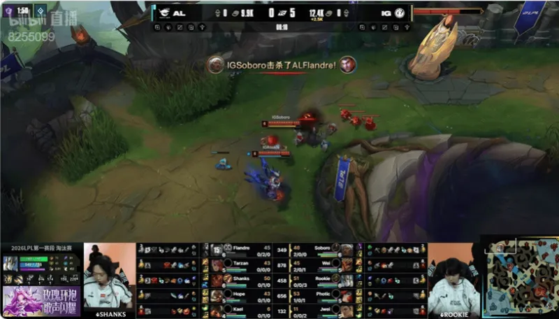 24分钟:Shanks岩雀被Rookie蹲到,Soboro狼母豪取四杀团灭AL